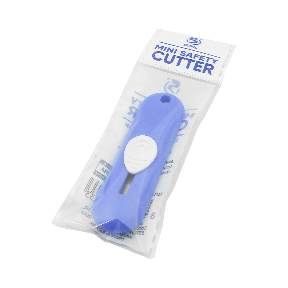SPIL – Mini taglierino, Colore Azzurro. Confezionamento: singolarmente imbustato. Lama da 9 mm. Funzione portachiavi: foro sul corpo per l’aggancio. Sicurezza: blocco lama integrato. Sistema lama: autorientrante per un utilizzo più pratico e sicuro, Design: compatto, leggero, facile da trasportare