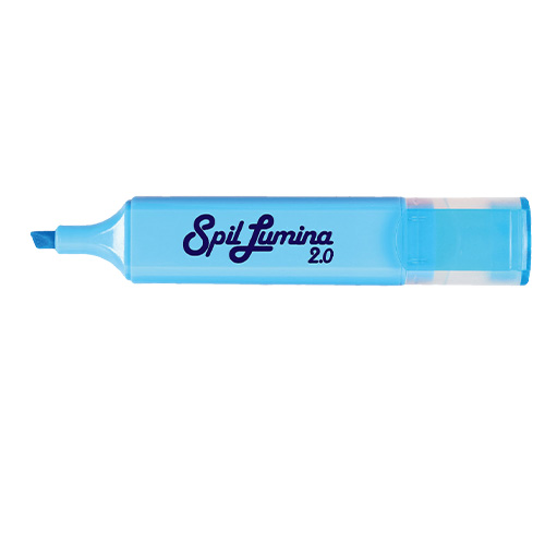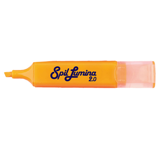 SPIL – Evidenziatore punta a scalpello, tappo con clip, 3g di colore. Disponibili in 6 colori fluo: Verde – Rosa – Lilla – Giallo – Arancione – Azzurro. Tappo in tinta con il fusto dell’evidenziatore. Evidenzia in maniera nitida