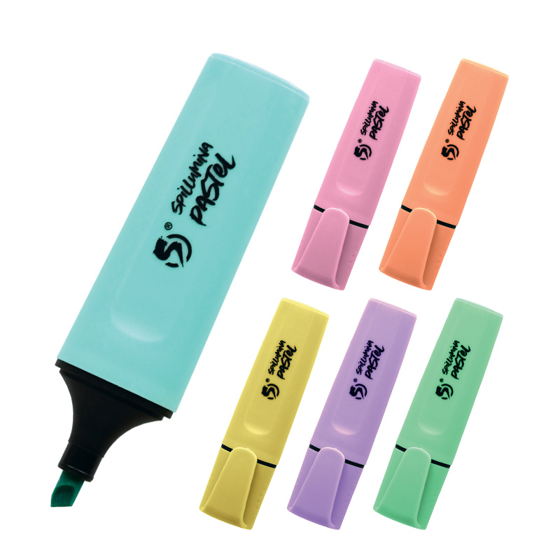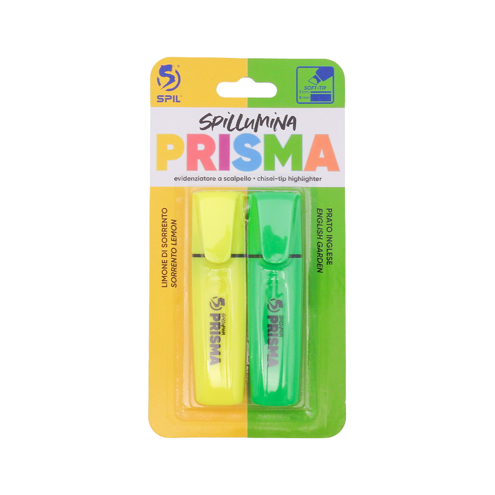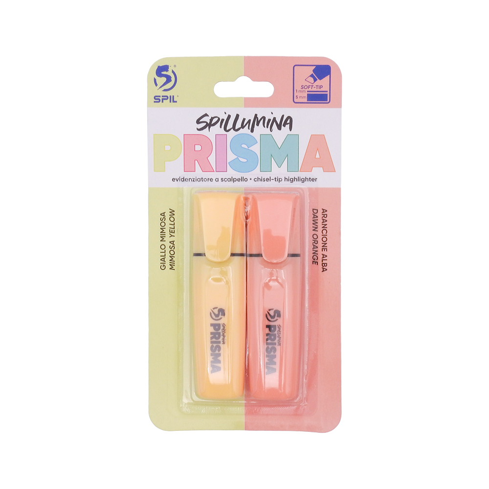 Spil – Evidenziatori punta soft a scalpello, fusto gommato, 4 grammi di inchiostro, 6 colori pastello e 2 fluo. Pezzi singoli, espositore da 36 pezzi e blister da 2 pezzi. Colori pastello disponibili: giallo, fucsia, verde, azzurro, arancio, rosa, arancione alba, giallo mimosa. Colori fluo disponibili: Giallo limoni di Sorrento, Verde prato. Design classico, dotato di tecnologia Anti-Dry-Out: resiste fino a 6 ore senza cappuccio. Doppia ampiezza di tratto 2 + 5 mm. Inchiostro a base d’acqua