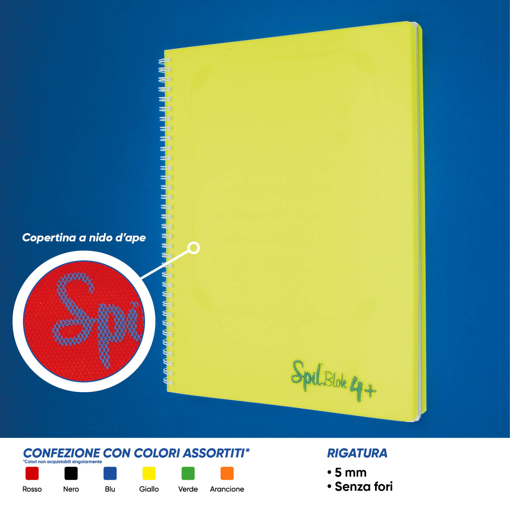 SPIL – Quaderno formato 22.5 x 29.7, copertina in PP a nido d’ape, cartoncino posteriore 900 grammi, spirale in metallo plastificato, 80 fogli di carta 80 grammi. Con il loro formato da 225 MM offrono un’ampia superficie di scrittura. Quando è necessario strappare un foglio, il formato utile rimane 210 x 297 MM. Disponibile con o senza fori.
