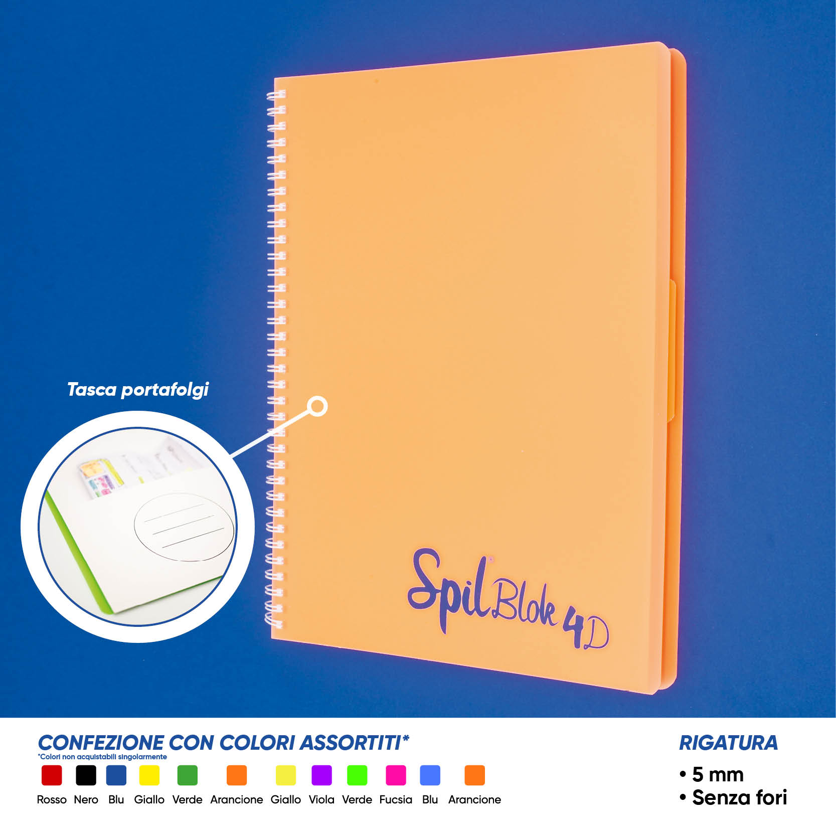 SPIL – Quaderno formato A4, copertina in PP, cartoncino posteriore 900 grammi, spirale in metallo plastificato, 80 fogli di carta 80 grammi, separatore in PP riposizionabile e tasca porta fogli. Ideale per l’università. Rigatura: 5mm