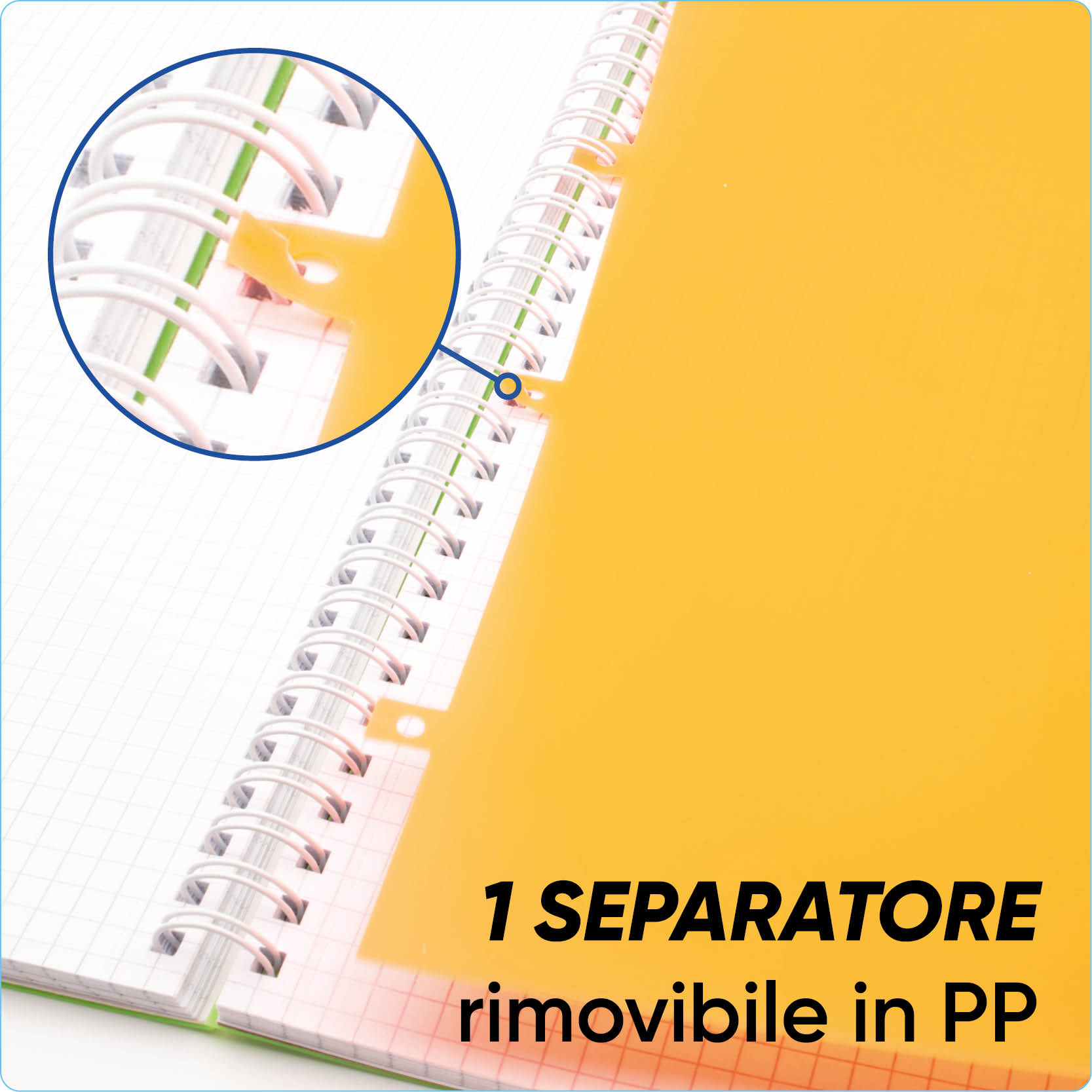 SPIL – Quaderno formato A4, copertina in PP, cartoncino posteriore 900 grammi, spirale in metallo plastificato, 80 fogli di carta 80 grammi, separatore in PP riposizionabile e tasca porta fogli