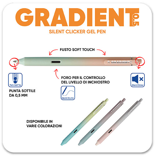 Penne Gradient Silent Clicker Gel Pen dall’inchiostro nero e doppia punta a sfera da 0.5 mm. Fusto soft touch con foro per vedere il livello dell’inchiostro, scatto silenzioso.